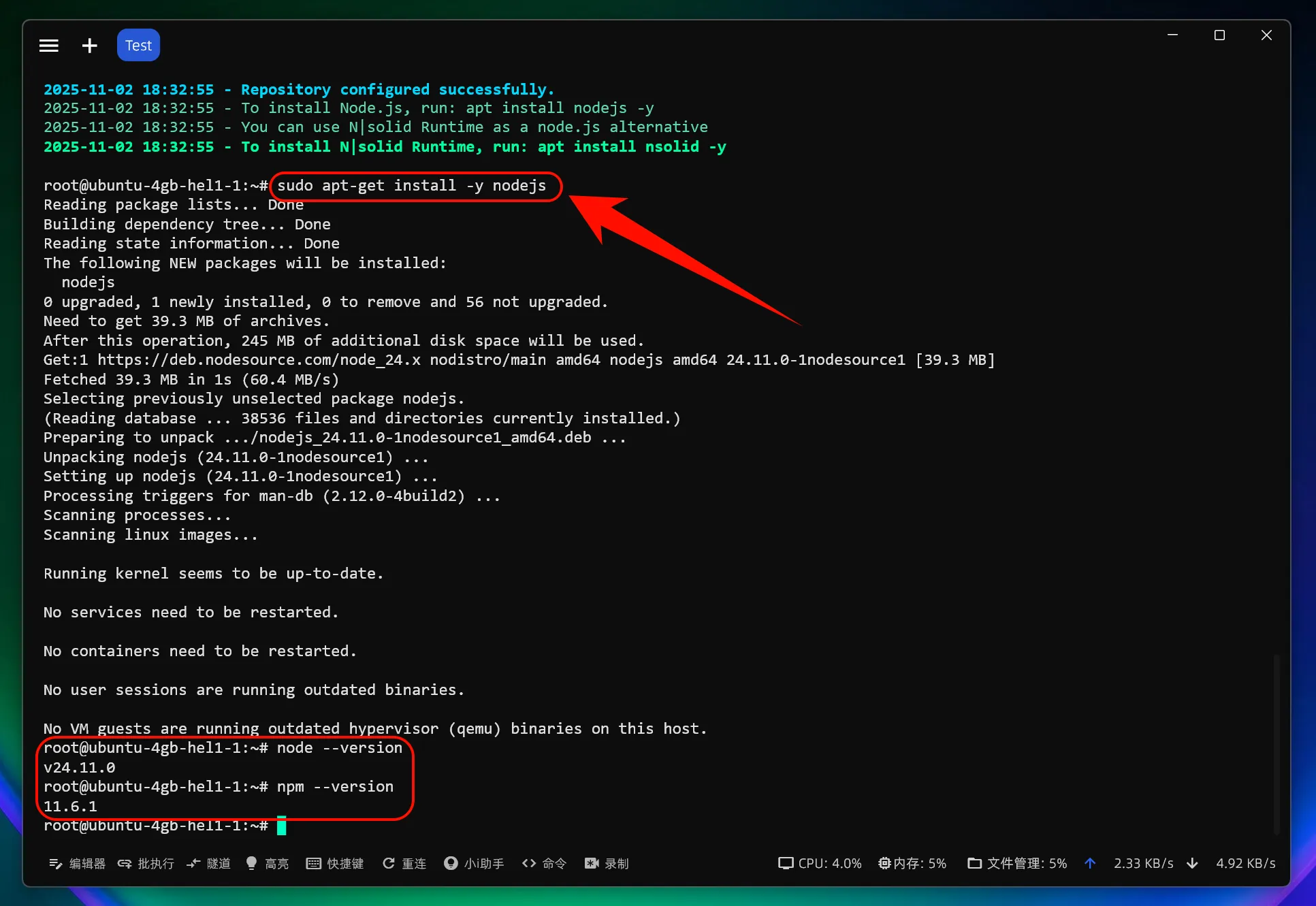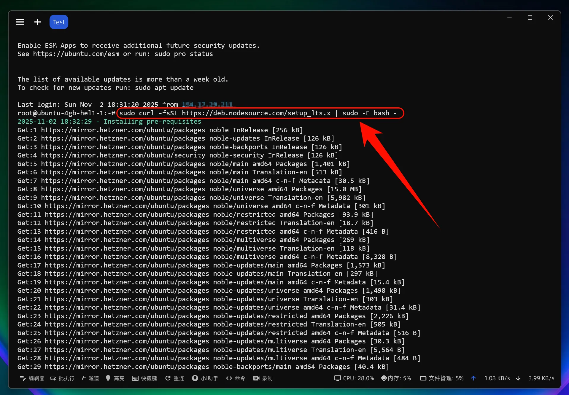 sudo curl -fsSL https://deb.nodesource.com/setup_lts.x | sudo -E bash -安装 Node.js: